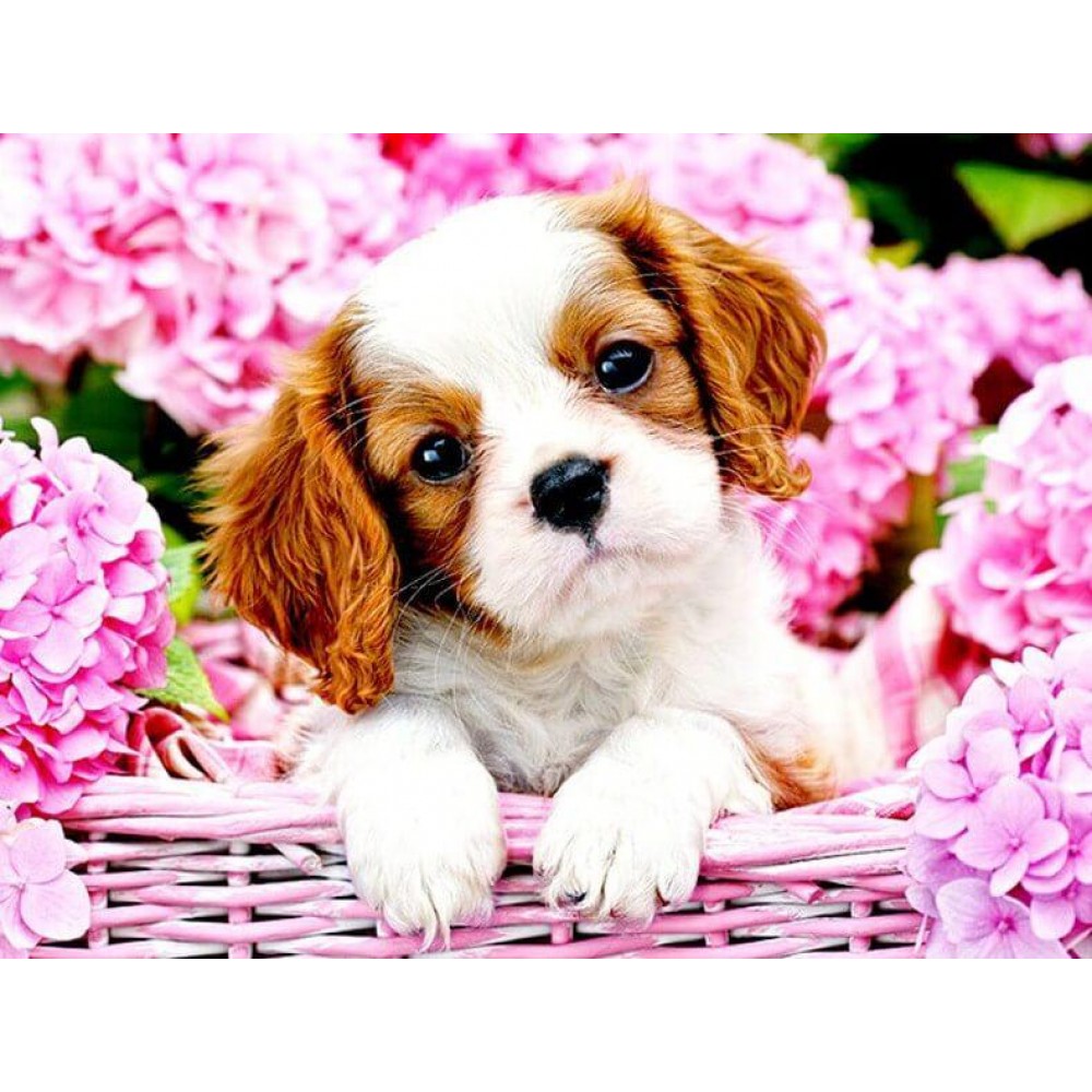 Puppy in Flower Basket